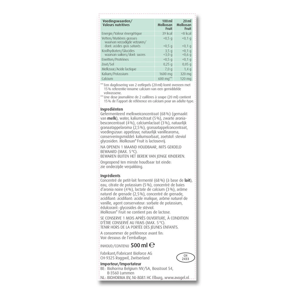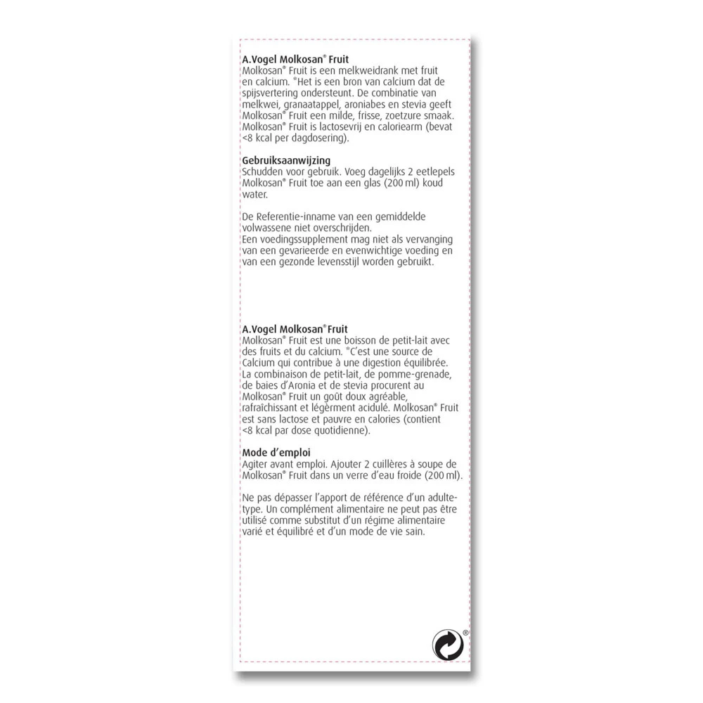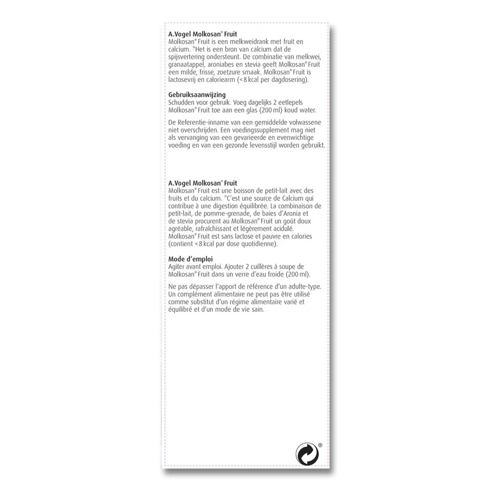 Molkosan Fruit van A.Vogel A.Vogel Molkosan Fruit bevat 100% natuurlijke melkwei met granaatappel, aroniabes en stevia. De combinatie van ingrediënten geven Molkosan Fruit een unieke, frisse, fruitige smaakbeleving. Molkosan is lactosevrij en caloriearm.Bron van CalciumMet melkwei, aroniabes, granaatappel, steviaFruitig van smaakLactosevrij, caloriearmLekker in de yoghurt of havermoutpapHeerlijk als dressing voor de saladeMaakt een een glas (200 ml) koud water of smoothie anders.