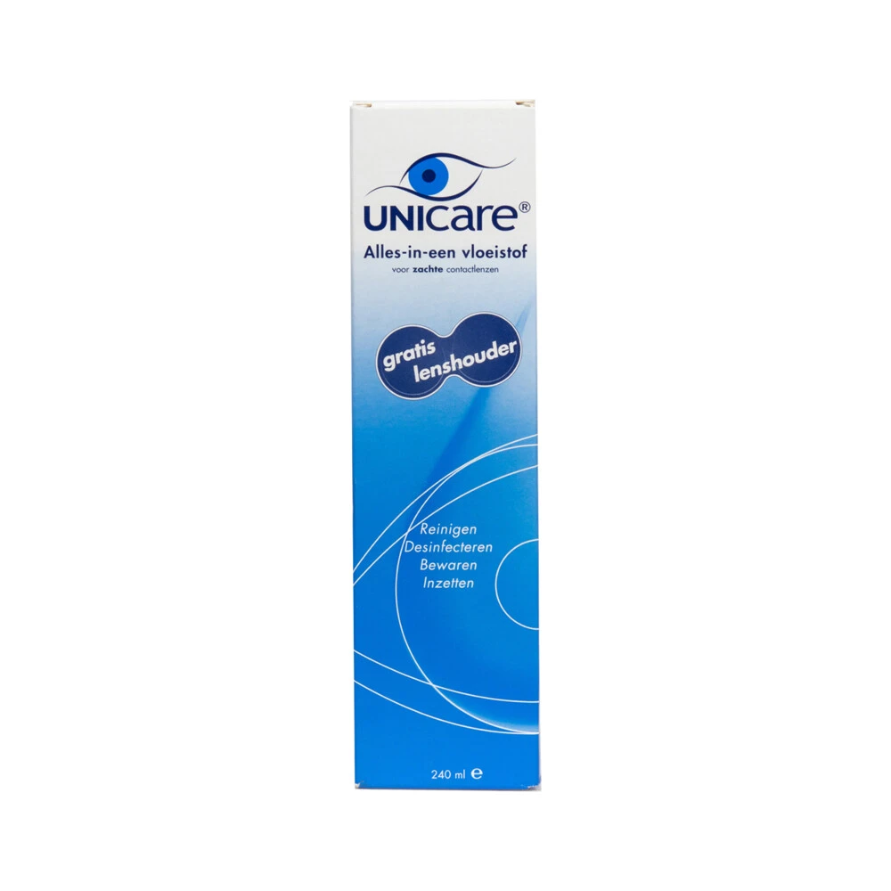Lenzenvloeistof zachte lensUnicare alles-in-een vloeistof voor zachte contactlenzen Een vloeistof die geschikt is voor het dagelijks schoonmaken, reinigen, bewaren en inzetten van zachte contactlenzen.