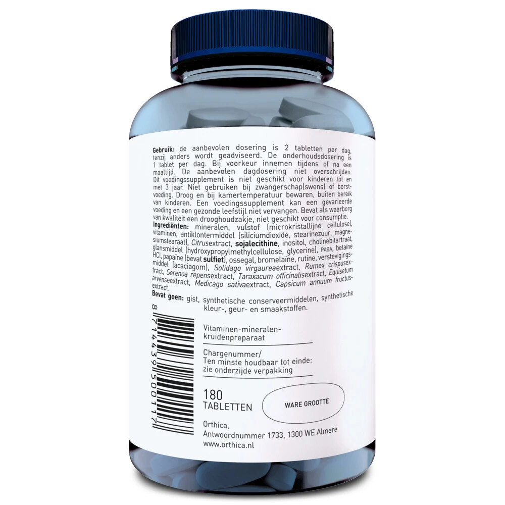 Orthica Multi 4 All Complete multi met kruiden en enzymenMulti 4 All van Orthica is een complete multi met vitaminen, mineralen, plantenextracten en enzymen. Hierdoor onderscheid Multi 4 All zich van andere multivitamine- en mineralenpreparaten. Multi 4 All ondersteunt het energieniveau2 en de weerstand1. Door de aanwezige B-vitaminen (B2, B3, B5, B6, B11, B12) en ijzer draagt deze multivitamine bij aan extra energie bij vermoeidheid en moeheid. Foliumzuur, ijzer, koper, selenium, vitamine A, B1